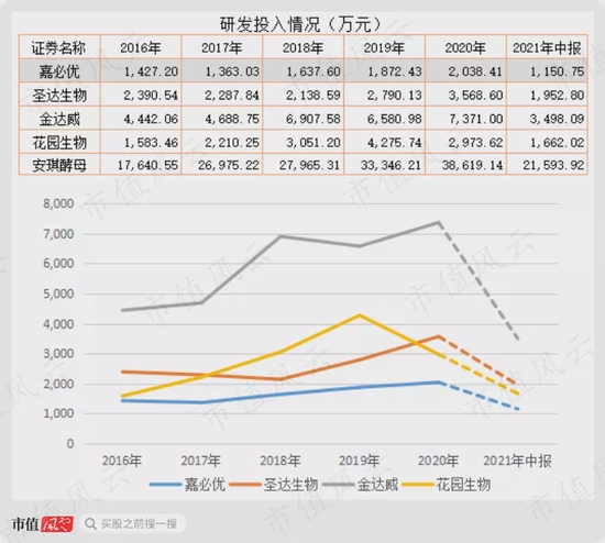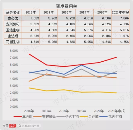 但从研发费用率来看,嘉必优又是最高的,基本保持每年6%左右研发费用率,高于安琪酵母、圣达生物等4家公司。