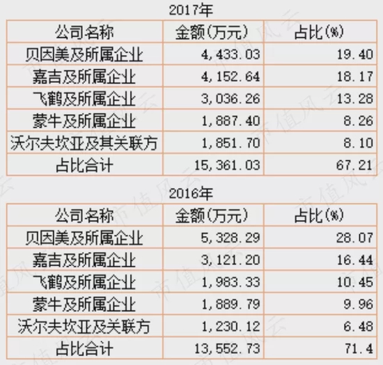 贝因美是嘉必优的非常重要客户,2016年、2017年为第一大客户,2018年为第二大客户。不巧的是,贝因美自2014年起业绩连续下滑,2016年和2017年更是连续亏损,这也就导致嘉必优的应收账款中有相当比例是贝因美“贡献”的。