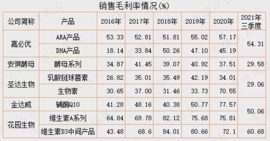 从毛利率看,该行业普遍较高,2018年以来嘉必优两大主要产品的毛利率均在45%以上,2021年三季度末综合毛利率接近55%;