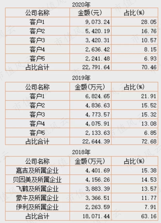 该公司对前五大客户的依存度非常高,基本在70%以上。从这个角度看,嘉必优的产品就是典型的2B且傍大腿业务。