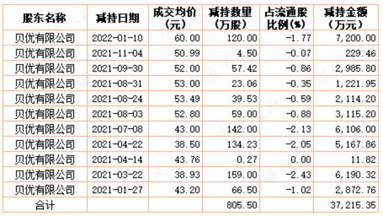 其中,贝优有限抛售最多,自2021年1月开始减持并一发不可收拾,截至2022年1月10日,累计减持超过800万股,合计套现至少3.7亿元。