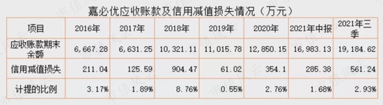 值得注意的是,2019年应收账款期末余额为1.1亿元,但对应的信用减值损失却只有61万元,计提比例还不到1%;2021年三季度末的应收账款账面余额攀升至1.9亿元,但信用减值也只有561万元,计提比例不到3%。