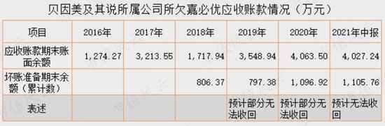 嘉必优在2021年中报披露,贝因美及其所属企业的欠款账面余额为4027万元,而上市公司对该笔应收账款的表述为预计无法收回,但是,实际上在2021年上半年并没有对该笔应收账款计提大额减值损失。