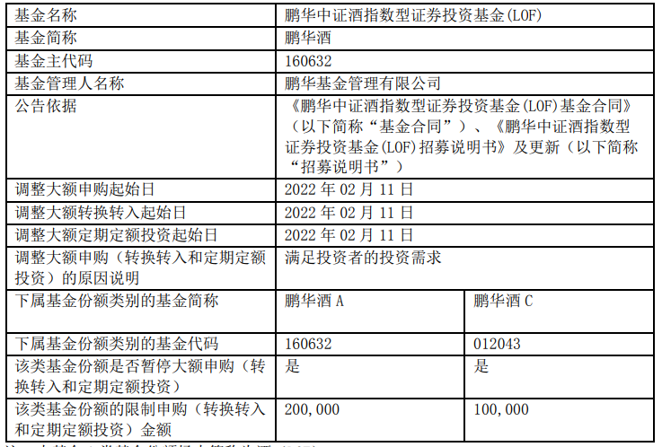 鹏华基金近日公告表示,鹏华中证酒指数基金A类份额,自2022年02月11日起,单日单账户累计申购、转换转入和定期定额投资金额限额由2万元调整为20万元。而C类基金份额单日单账户累计申购、转换转入和定期定额投资金额限额由1000元调整为10万元。