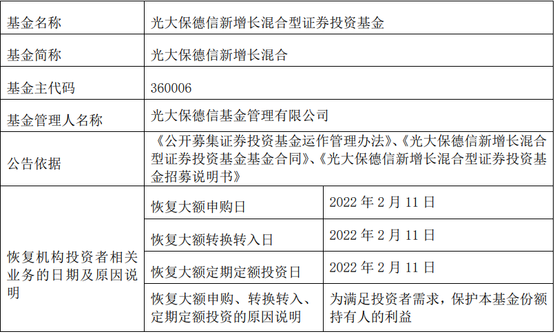 比如大成基金公告显示,韩创管理的大成新锐产业混合,自2022年2月14日起取消50万元的申购限制。还有光大保德信基金公告显示,魏晓雪管理的光大新增长混合,自2022年2月11日起恢复机构投资者的大额申购、转换转入、定期定额投资业务。