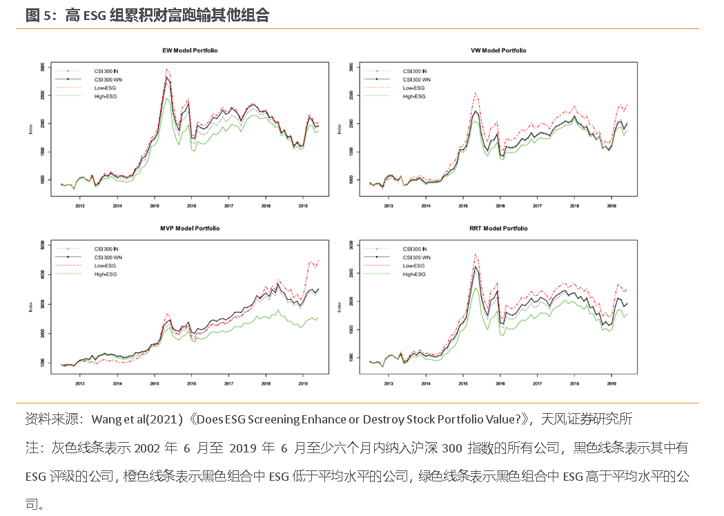 与这篇文章类似的是,Wang et al(2021)在《Does ESG Screening Enhance or Destroy Stock Portfolio Value?Evidence from China》也对ESG的正面作用提出了质疑。他们基于彭博对A股的ESG评分构建了等权重 (EW)、价值加权 (VW)、最小方差 (MVP) 和风险报酬时机策略 (RRT) 四类组合,指出高ESG组虽然方差和尾部风险偏低,但样本外回报和夏普比率也会偏低,ESG筛选破坏了投资组合的价值。