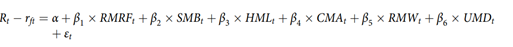 组合层面上,他们按照ESG评分高低将A股样本分为十组,对十组分别进行多因素模型回归。回归公式如下,其中RMRF/SMB/HML/CMA/RMW/UMD分别代表市场因子、市值因子、账面市值比因子、投资因子、盈利因子、动量因子。