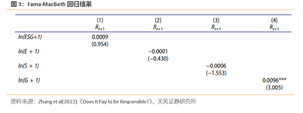 个股层面上,他们使用个股本月收益率和上月的ESG评分进行Fama-MacBeth回归。回归公式为