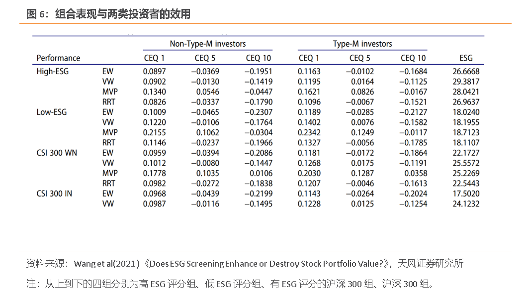 更进一步地,他们还将投资者分为单纯追求投资收益的(Non-Type-M)和愿意为ESG表现支付溢价的(Type-M)两类,分别考察了组合表现对两类投资者效用的影响。前者的效用函数只包含收益和风险,无论风险规避系数如何,高ESG组合都会带来较低的效用;后者的效用函数除风险和收益项外还包含ESG评分的补偿项(假定补偿系数为0.001),这就使得高ESG组合的效用有所提升,但通过ESG筛选得到的额外效用不一定能够弥补限制投资范围带来的效用损失,例如风险规避系数为1时高ESG组的效用低于低ESG组和沪深300组。