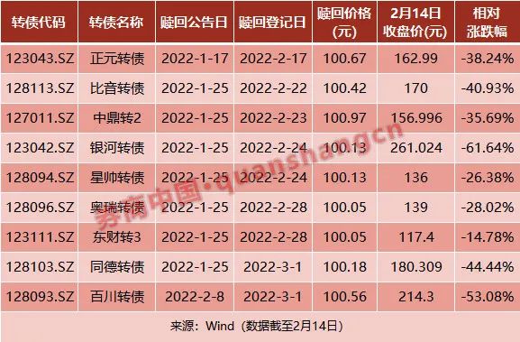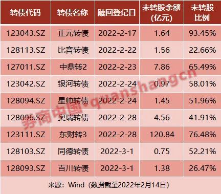 进入2月中下旬,可转债市场将迎来一波“赎回潮”。2月17日至3月1日,共有9只可转债将迎来赎回登记日。