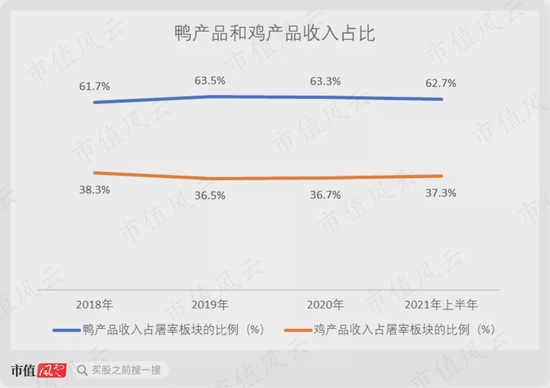 屠宰板块生产的产品可以分为两大类:鸡产品和鸭产品。2018-2021年上半年,鸭产品收入占屠宰板块收入的比例一直保持在60%以上,剩下的全部是鸡产品。