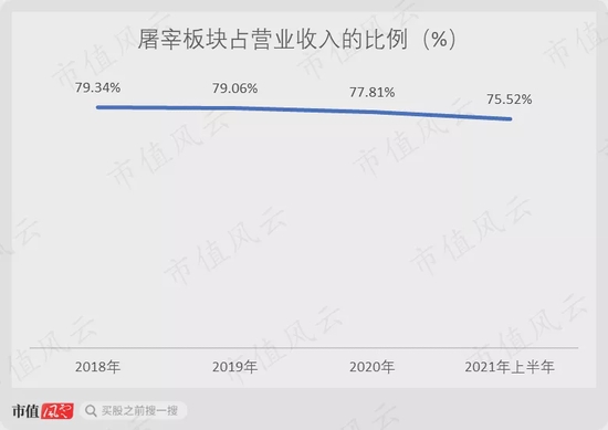 益客食品共有四大业务板块:屠宰板块、饲料板块、种禽板块以及调熟板块。2018-2021年上半年,屠宰板块收入占营业收入的比例略微有所降低,但依旧保持在70%以上。