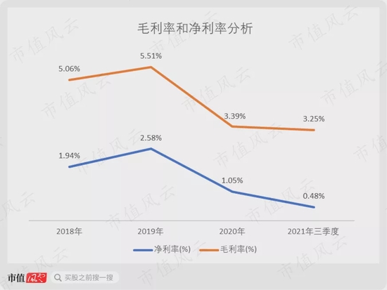 而且更为关键的是,毛利率还面临着下降的风险。公司毛利率从2019年5.51%下降至2021年三季度的3.25%,同期净利率也从2.58%下降至0.48%。
