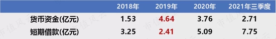 除了2019年之外,2018年、2020年以及2021年三季度末的货币资金,都低于同期的短期借款。公司短期流动性风险非常高。