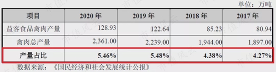 纵向看,益客食品每年禽肉产量的增速要快于整个行业的增速,这导致公司的市场份额是逐渐升高的。益客食品的市场份额从2017年的4.27%稍稍提高到2020年的5.46%。