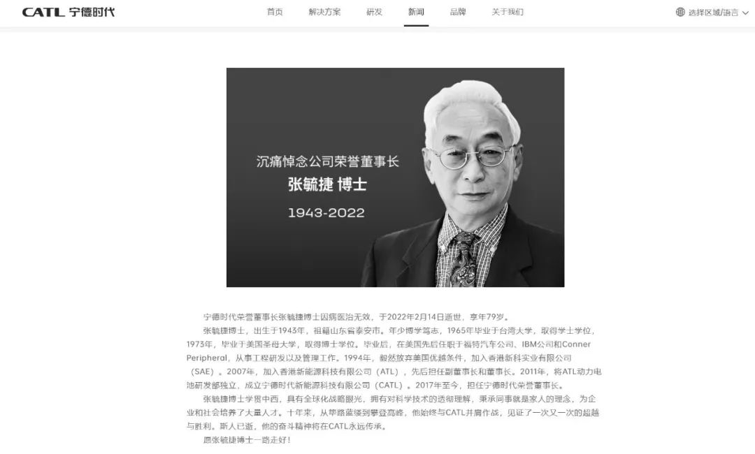 热点栏目 2月15日,宁德时代在其官网发布讣告,称宁德时代荣誉董事长张毓捷博士因病医治无效,于2022年2月14日逝世,享年79岁。