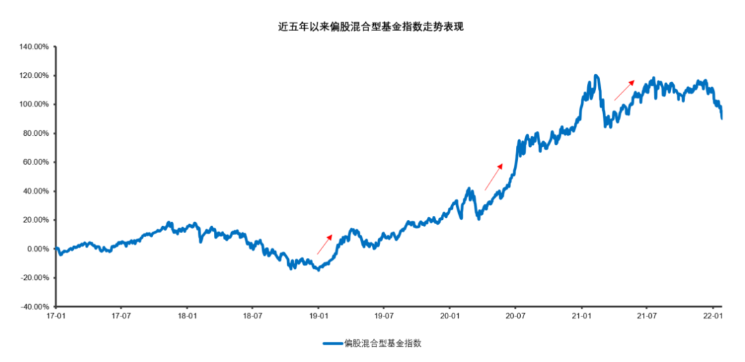 以偏股混合型基金指数为例,wind数据显示,从2012年以来的近五年内,该指数经历了多次调整,但我们现在回过头去看的话,每一次回调后指数都有所反弹,甚至还可能不断创出新高。