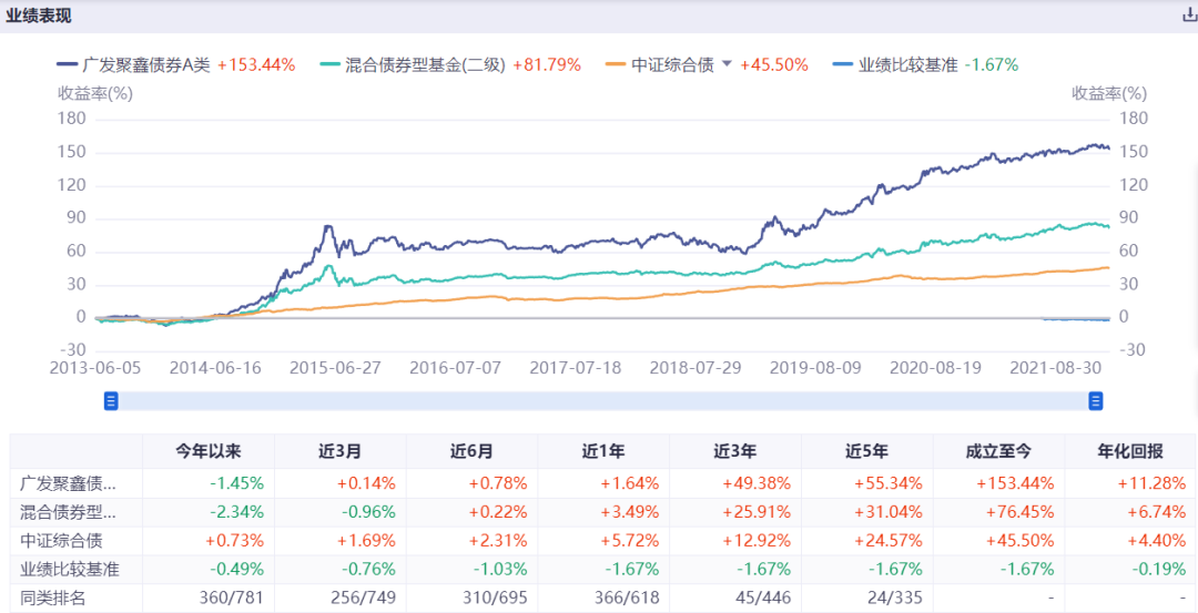 该基金为二级债基,成立于2013年6月,成立8年多来,累计总回报达到153.44%,年化回报超11%。这也是广发基金旗下固收+旗舰产品,最新规模达到194亿元,现任基金经理为广发固收+领军人物张芊,她从2013年7月管理至今,8年多时间任职总回报达到152.43%,任职年化回报为11.36%。