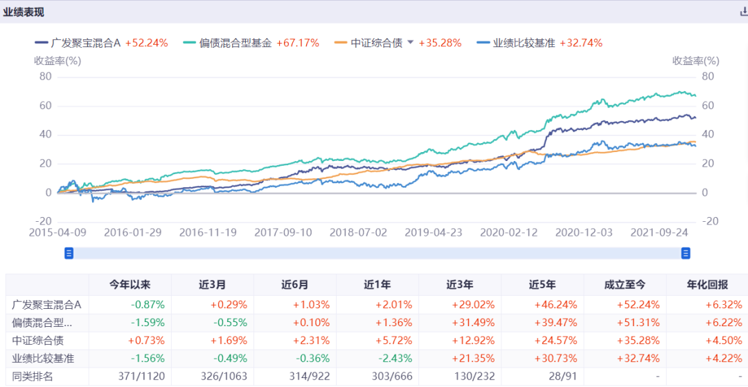 老司基发现,广发聚宝混合A从2016年-2021年的6个完整自然年度均实现了年度正收益,近3年的年度收益率分别为7.02%、17.47%和5.04%,近3年最大回撤仅2.75%。