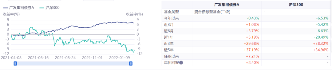 该基金成立于2016年5月,成立5年多来,累计总回报为39.8%,现任基金经理为固收老将曾刚,他于2021年4月接管该基金,任职总回报为7.21%。