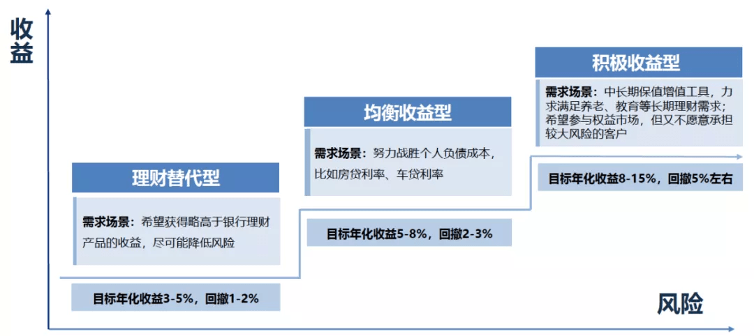第一类是理财替代型,追求年化收益3%-5%,最大回撤目标1%-2%;