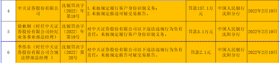 而就在前一天的2月14日,东北的券商中天证券也受到处罚。这也是证券行业收到的虎年第一张反洗钱罚单。中天证券被央行沈阳分行罚款137.1万元,2名相关人员对此负有责任,也均被处以罚款。