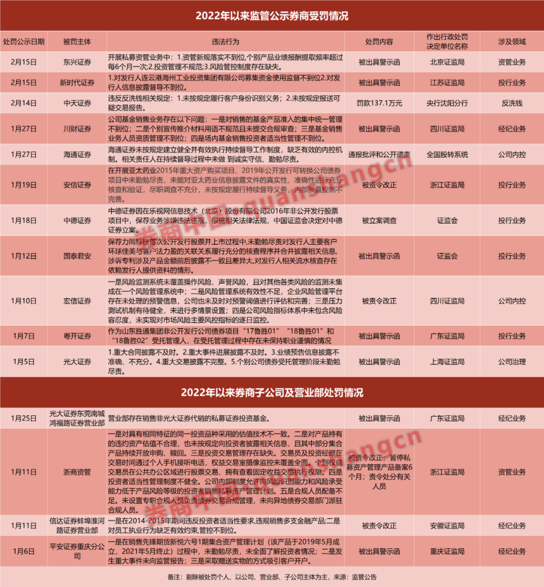 根据券商中国记者不完全统计,2022年1月以来,证券行业公司及证券从业人员合计收到45张罚单,涉及券商20家。剔除被处罚的券商员工,券商、券商分公司、券商营业部和券商资管子公司在内合计15个主体被罚或被立案调查。