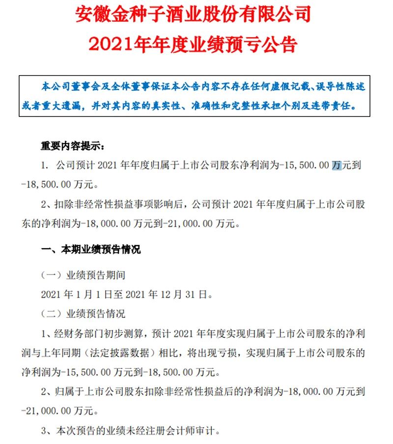 今年1月,金种子酒曾发布2021年年度业绩预亏公告。公司预计2021年年度归属于上市公司股东的净利润为-1.55亿元到-1.85亿元。扣非后,公司预计2021年年度归属于上市公司股东的净利润为-1.8亿元到-2.1亿元。这也预示着,该公司于2020年实现业绩扭亏为盈之后,或将再度亏损。