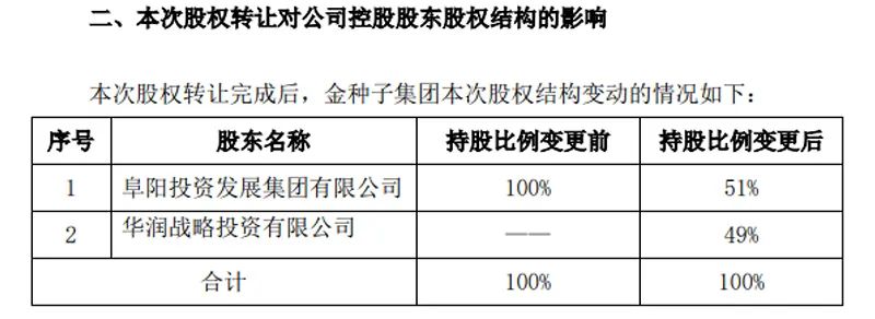 金种子酒表示,本次交易后,公司控股股东引入重要战略股东,双方进行长期合资合作。本次交易不会导致公司控股股东和实际控制人变更,公司控股股东仍为金种子集团、实际控制人仍为阜阳市国资委。本次股权转让是央企下属子公司与地方国资企业之间战略性重组,拟采用非公开协议转让方式,尚需获得有关部门的审批后生效。