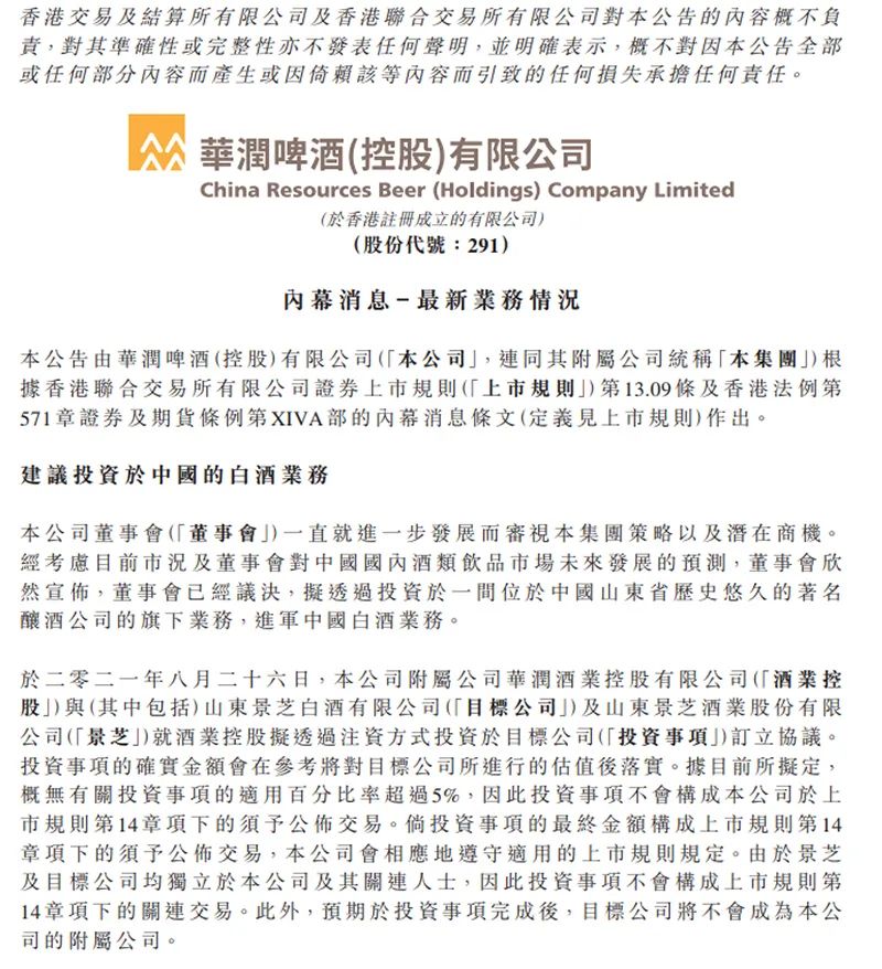彼时,华润啤酒表示,公司一直就进一步发展其业务而检讨策略并探索商机。此次投资景芝白酒为一个意义重大的里程碑,意味着公司进军中国白酒市场,此举将有利于公司潜在的后续业务发展以及产品组合及收入来源多元化。公司董事会认为,此次投资属于策略性(投资),将令公司处于更有利位置,以进一步评估公司的业务多元化策略。公司将继续致力于中国的啤酒酿造业务。