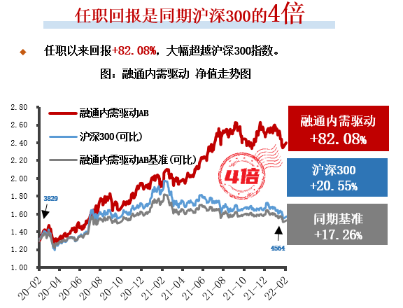 任职回报为82.08%(同期业绩比较基准为17.26%),年化回报为34.88%,是同期沪深300指数的4倍。
