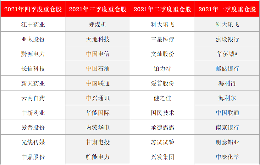 2021年三季报公布的前十大重仓股,均未出现在2021年四季报的前十大重仓里。