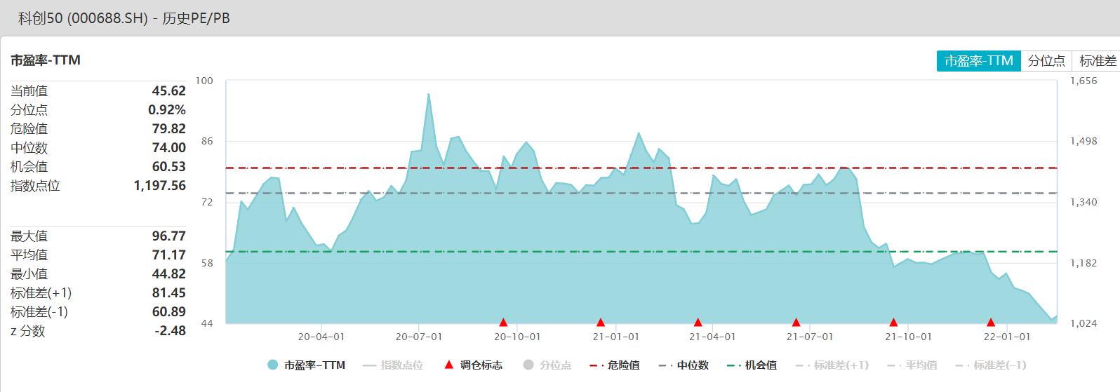 还有科创板50指数,市盈率TTM的当前值为45.62,在历史分位中处于0.92%的位置,同样也是历史低位。