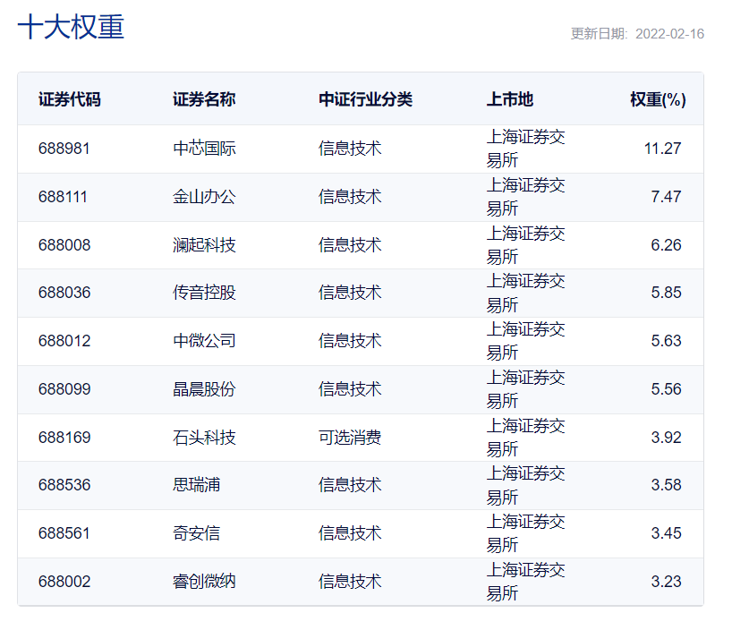再从前十大权重股来看,根据2月16日更新的信息显示,十大权重股如下: