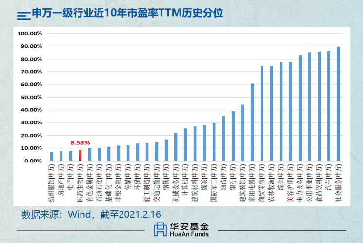 Wind数据显示,从申万所属一级行业的近10年市盈率TTM历史分位点来看,医药生物处于近10年市盈率TTM历史分位点8.56%的位置,在31个一级行业中排在第四位,前期过高的估值已经得到充分消化。