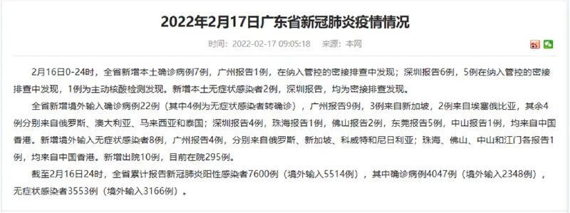 2月17日,广东省卫健委披露,2月16日0-24时,广东全省新增本土确诊病例7例,广州报告1例,在纳入管控的密接排查中发现;深圳报告6例,5例在纳入管控的密接排查中发现,1例为主动核酸检测发现。新增本土无症状感染者2例,深圳报告,均为密接排查发现。