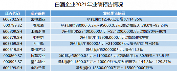 白酒板块不是所有企业均取得了正增长。顺鑫农业(000860.SZ)预计净利润0.80亿元至1.10亿元,同比降幅超过70%;皇台酒业(维权)(000995.SZ)预计亏损1000万元至亏损1500万元;金种子酒(600199.SH)预计亏损1.55亿元至亏损1.85亿元。