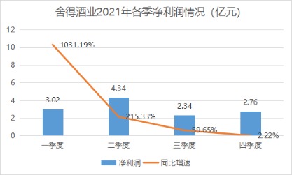 由业绩快报可计算得,舍得酒业2021年第四季度单季净利润2.76亿元,单季同比增速只有微幅的2.22%。