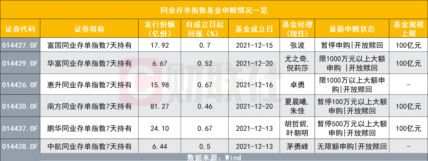 目前,除中航基金旗下的同业存单指数基金以外,其余5家基金公司旗下的同业存单指数基金均处于限额申购或暂停申购的状态。此外,市场上运行的6只同业存单基金中有4只设置了100亿元的规模上限。