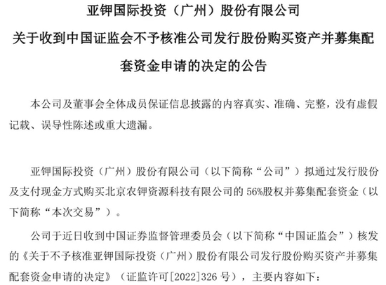 2月18日,亚钾国际公告称,证监会近日对公司本次发行股份购买农钾资源56%股权并募集配套资金申请作出不予核准的决定。