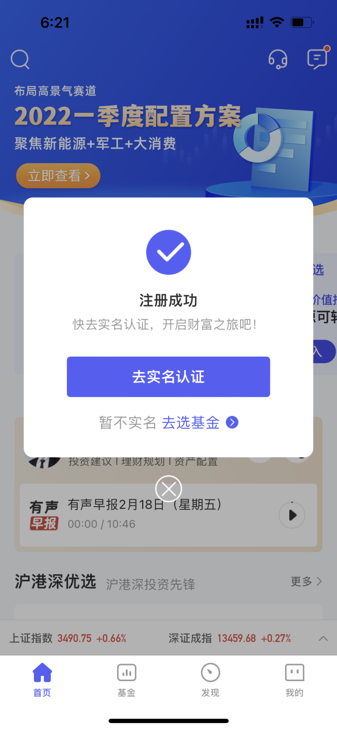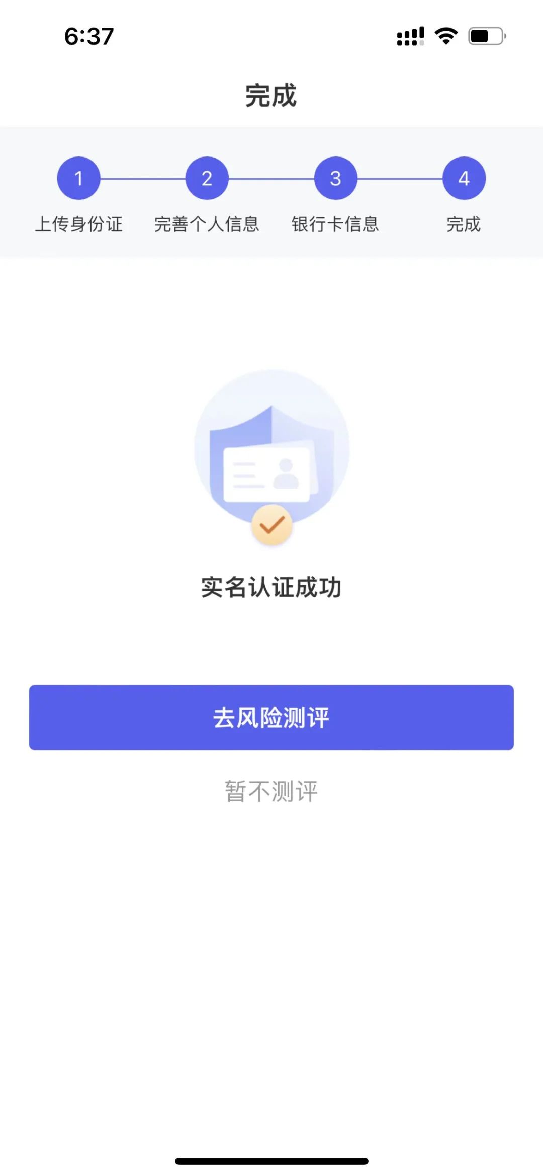 系统将提示您实名认证成功,至此您已开户成功,请参与风险测评,为之后的基金申购做准备哦~