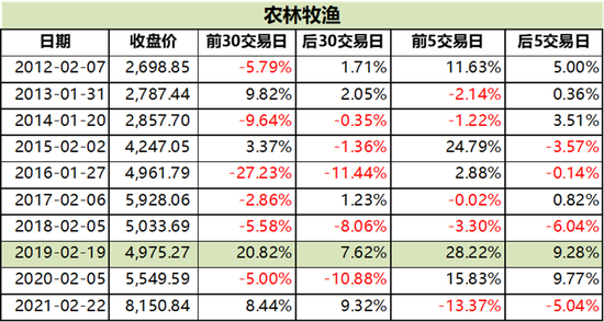 从2012年至2021年,共计十个一号文件。基于中信农林牧渔指数,《读树一帜》统计了文件发布日之前5个交易日、30个交易日,以及之后5个交易日、30个交易日的市场表现。结果如下,表中红色代表下跌,日期为相应年度一号文件发布时间(如遇周日,则顺延一天)。
