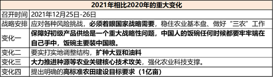 从历史来看,往年中央农村工作会议内容尽管把农业放在极高的位置上,如2020年的中央农村工作会议,强调“全面推进乡村振兴,加快农业农村现代化,是需要全党高度重视的一个关系大局的重大问题”,但是2021年的会议则明确将农业农村问题强调为“着眼国家战略需要”。