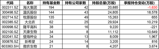 下表为公募基金加仓数量居前的前十大个股。不难看出,重点集中在生猪板块以及种子板块。