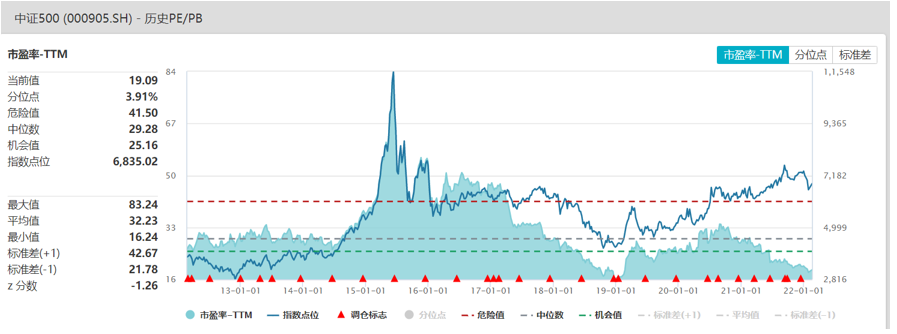 中证500指数目前市盈率为19倍,过去十年历史百分位水平为3.91%,这个算是绝对的低估值了,但是中证500指数19倍的市盈率相比沪深300指数13倍的市盈率而言,绝对值还是高出不少。