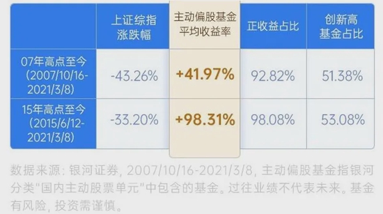 兴证全球基金曾做过的一项统计显示,如果在2015年高点(6月12日)买入主动偏股基金,截至去年3月8日,平均收益率近42%,正收益基金占比近93%;如果在2007年高点(10月16日)买入,则平均涨幅超98%,正收益比重为98%。