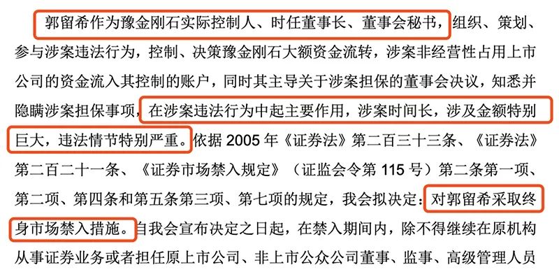 基于上述情况,证监会依法拟对公司及高管作出行政处罚:责令*ST金刚改正,给予警告,并处以500万元罚款;对郭留希予以警告,并处以1500万元罚款,郭留希在涉案违法行为中起主要作用,涉案时间长,涉及金额特别巨大,违法情节特别严重,证监会对其采取终身市场禁入措施。