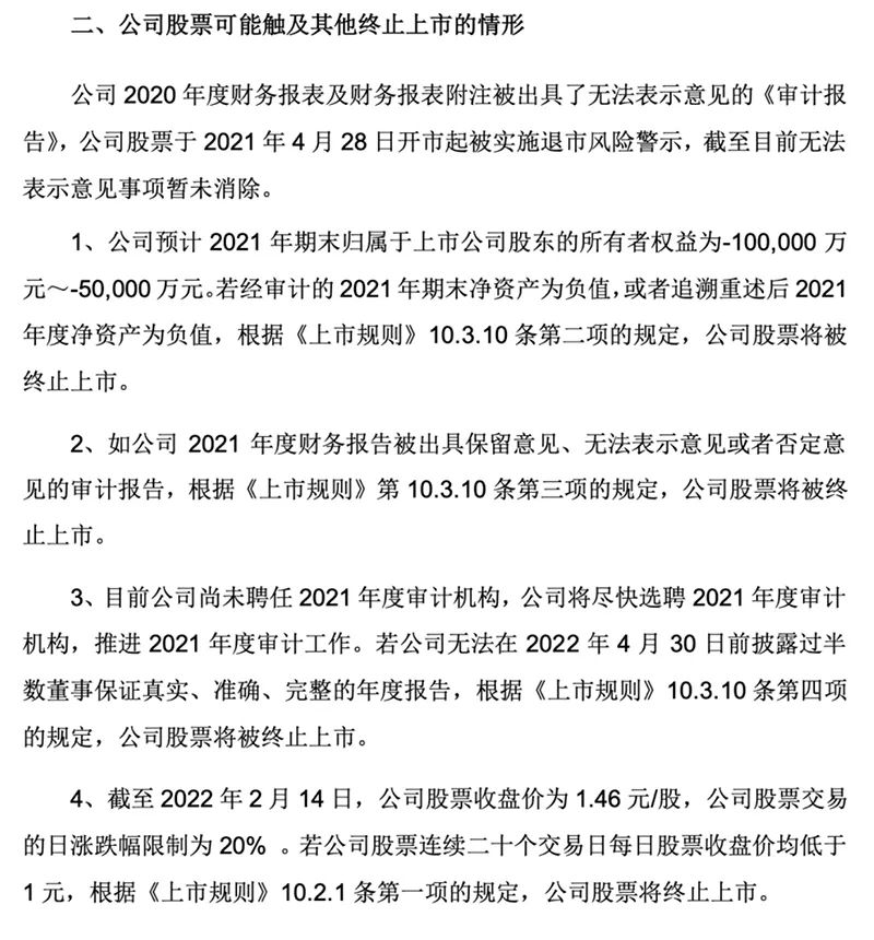 据*ST金刚披露,2020年度财务报表及财务报表附注被出具了无法表示意见的《审计报告》,公司股票于2021年4月28日开市起被实施退市风险警示,截至目前无法表示意见事项暂未消除。若经审计的2021年期末净资产为负值,或者追溯重述后2021年度净资产为负值,根据相关规定,公司股票将被终止上市。