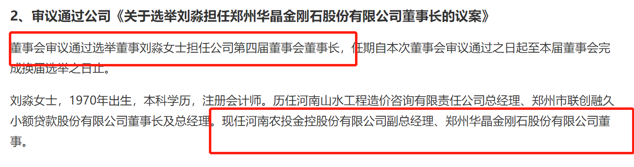 公开资料显示,刘淼女士,1970年出生,本科学历,注册会计师。历任河南山水工程造价咨询有限责任公司总经理、郑州市联创融久小额贷款股份有限公司董事长及总经理。现任河南农投金控股份有限公司(下称“农投金控”)副总经理、郑州华晶金刚石股份有限公司董事。