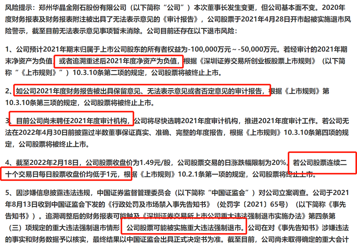 需要指出的是,由于*ST金刚存在长期系统性财务造假,公司可能存在追溯调整后的净资产连续三年(2019年、2020年、2021年)为负的情形,股票可能被实施重大违法强制退市。